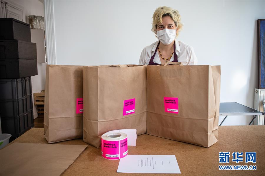 4月23日,在法国巴黎,玛丽·沙瓦罗将餐盒打包。 玛丽·沙瓦罗是一名厨师,四年前在巴黎开了一家实验厨房,倡导有机健康的食材、食谱和烹饪方式。自4月1日以来,她成为了医护人员的“私人主厨”,通过网上募捐的方式筹集资金,每周利用四天时间为巴黎科尚医院(收治新冠病人的重要医院)的医护人员制作餐食,并外送到医护人员手中。 新华社发(奥雷利安·莫里萨尔摄)