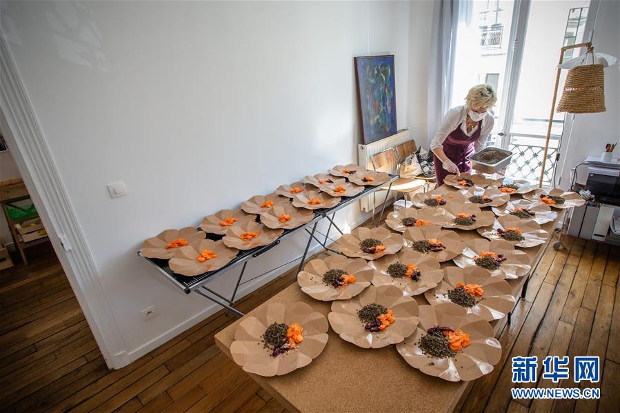 4月23日,在法国巴黎,玛丽·沙瓦罗为医护人员准备午餐。 玛丽·沙瓦罗是一名厨师,四年前在巴黎开了一家实验厨房,倡导有机健康的食材、食谱和烹饪方式。自4月1日以来,她成为了医护人员的“私人主厨”,通过网上募捐的方式筹集资金,每周利用四天时间为巴黎科尚医院(收治新冠病人的重要医院)的医护人员制作餐食,并外送到医护人员手中。 新华社发(奥雷利安·莫里萨尔摄)