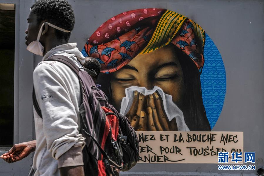 4月23日,在塞内加尔首都达喀尔,一名男子从宣传预防新冠措施的涂鸦前走过。新华社发 (埃迪·彼得斯摄)