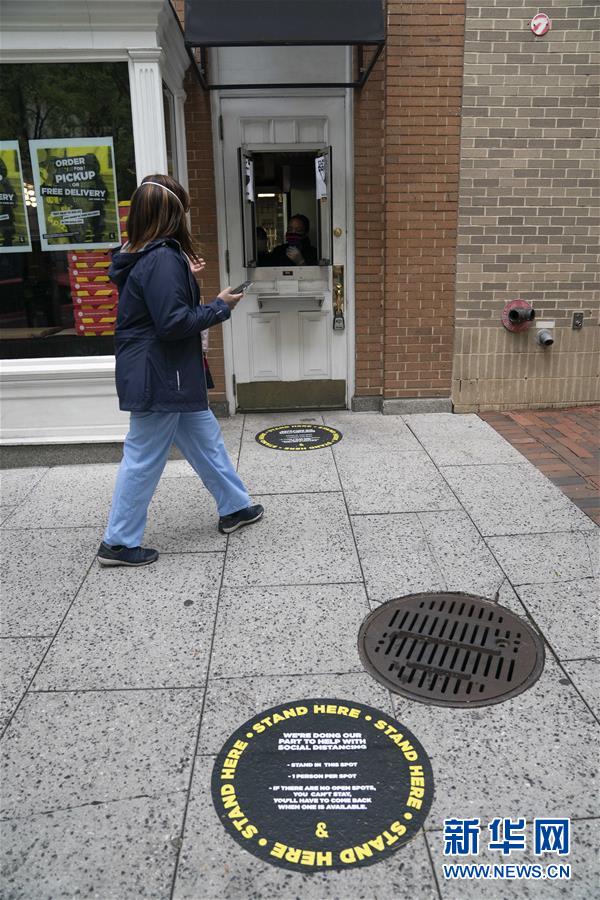 4月24日,在美国首都华盛顿,一名女士来到一家餐馆的窗口取餐。新华社记者 刘杰 摄