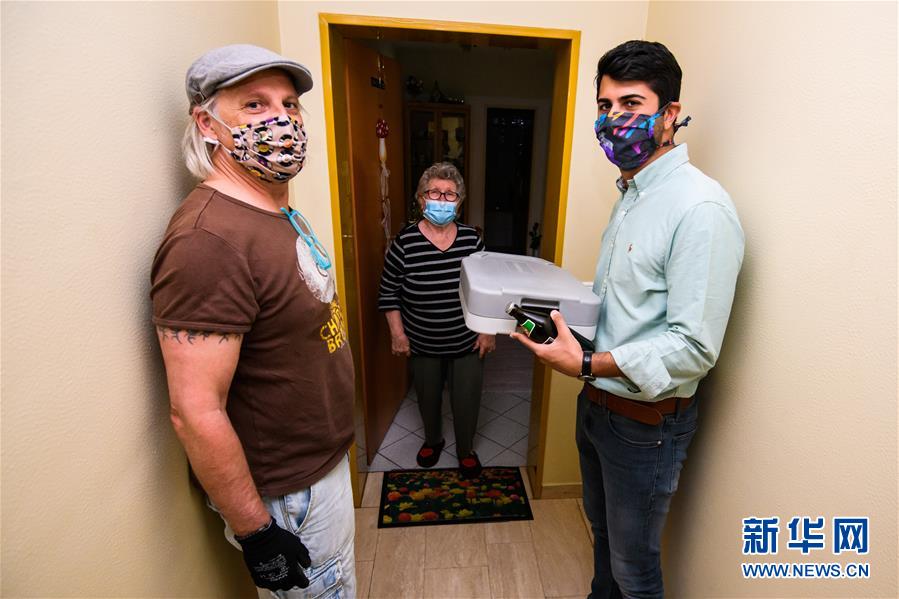 4月24日,在德国南部的罗森海姆,志愿者阿布扎尔·埃尔多安(右)与马丁·利奥波德塞德尔(左)将免费餐食送到一名女子家中。新华社发(凯文·福格特摄)