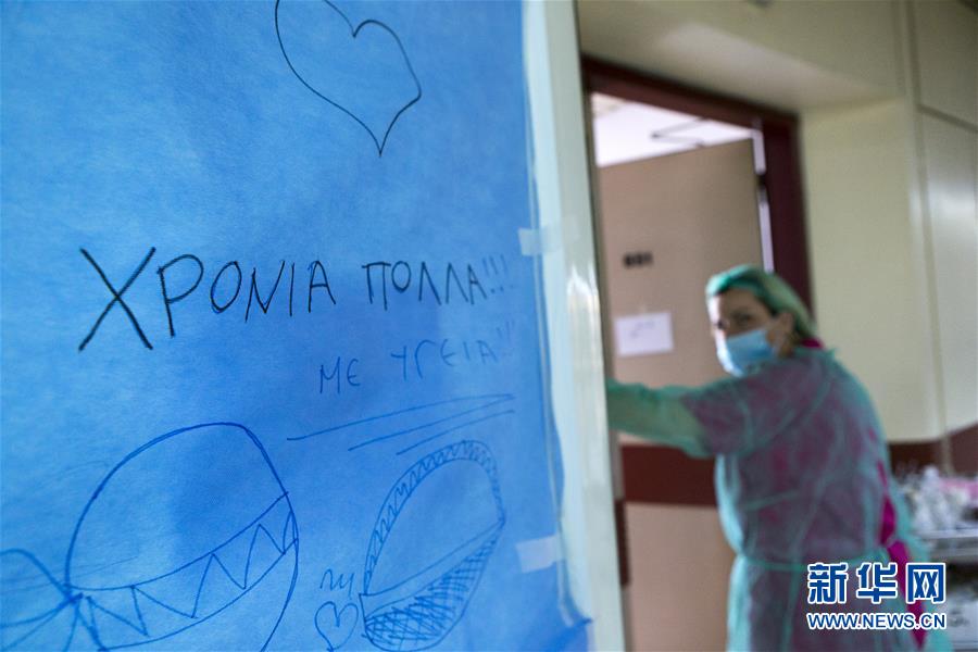 4月24日,在希腊首都雅典市中心的福音综合医院,治疗新冠肺炎病人的重症病房外贴着一张写有“祝你健康”字样的纸。 福音综合医院是雅典所在阿提卡区三家收治新冠肺炎病人定点医院之一。 新华社发(马里奥斯·罗洛斯 摄)
