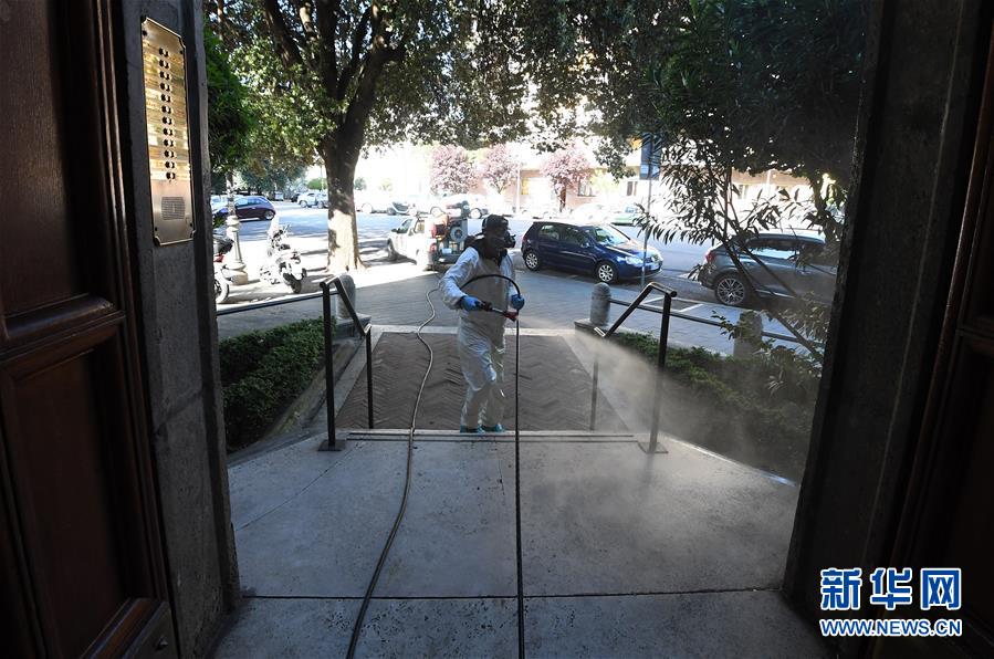 4月27日,工作人员在意大利首都罗马一栋住宅楼外喷洒消毒液。 当日,意大利罗马的一处住宅楼物业请来消毒公司的工作人员为整座建筑及周边消毒,保障居民出入安全。 新华社发(阿尔贝托·林格利亚 摄)