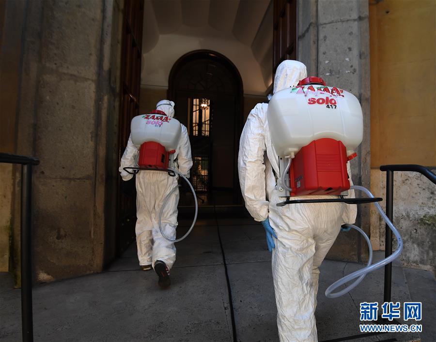 4月27日,工作人员准备进入意大利首都罗马一栋住宅楼喷洒消毒液。 当日,意大利罗马的一处住宅楼物业请来消毒公司的工作人员为整座建筑及周边消毒,保障居民出入安全。 新华社发(阿尔贝托·林格利亚 摄)