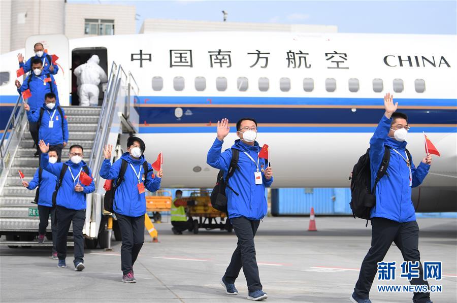 4月27日,联合工作组成员走下飞机。 当日,中国赴吉尔吉斯斯坦联合工作组一行10人完成工作任务,飞抵乌鲁木齐地窝堡国际机场。 新华社记者 沙达提 摄