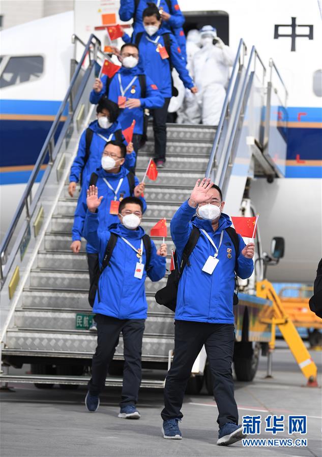 4月27日,联合工作组成员走下飞机。 当日,中国赴吉尔吉斯斯坦联合工作组一行10人完成工作任务,飞抵乌鲁木齐地窝堡国际机场。 新华社记者 沙达提 摄