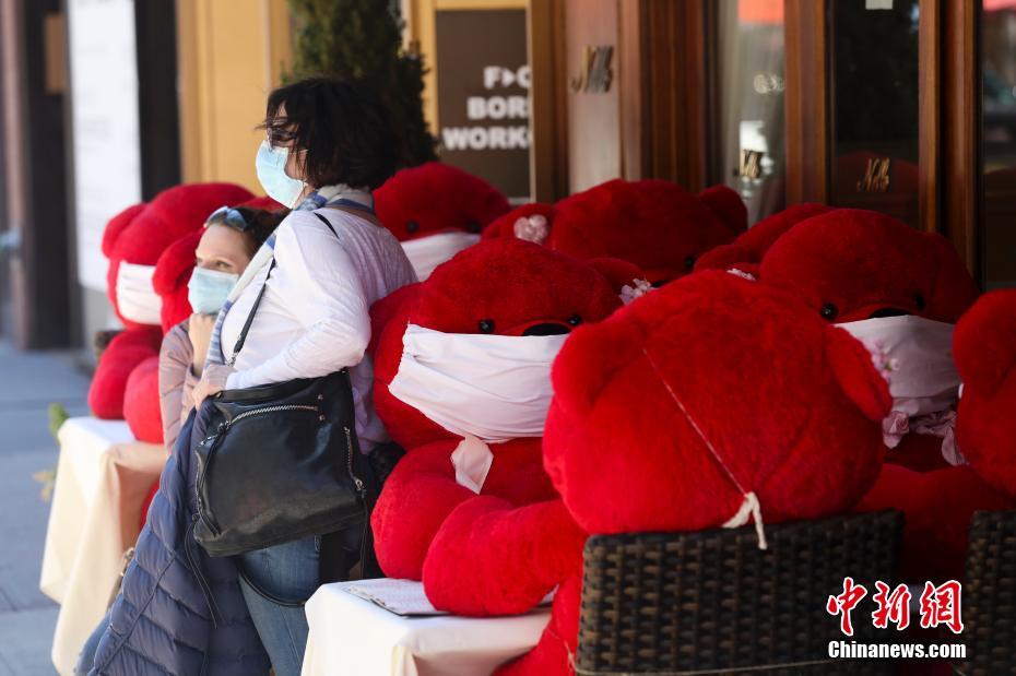 当地时间4月28日,美国纽约一家餐厅在室外餐位上放置戴口罩的玩偶吸引路人。中新社记者 廖攀 摄