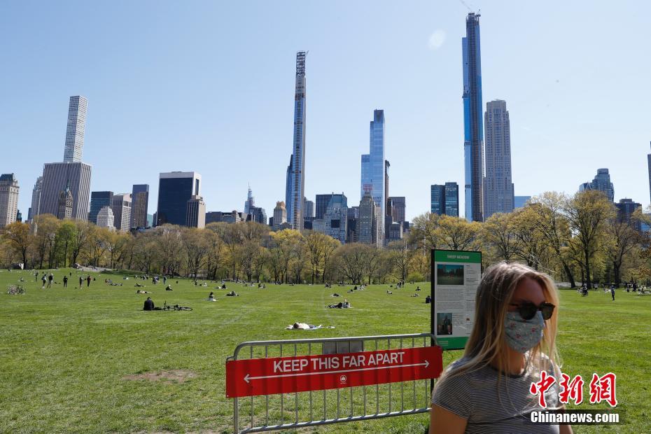 当地时间4月28日,新冠肺炎疫情下的纽约中央公园草坪树立警示牌,提醒人们保持社交距离。据美国约翰斯·霍普金斯大学发布统计数据,截至28日傍晚,美国累计新冠肺炎确诊病例已经超过101万例。中新社记者 廖攀 摄