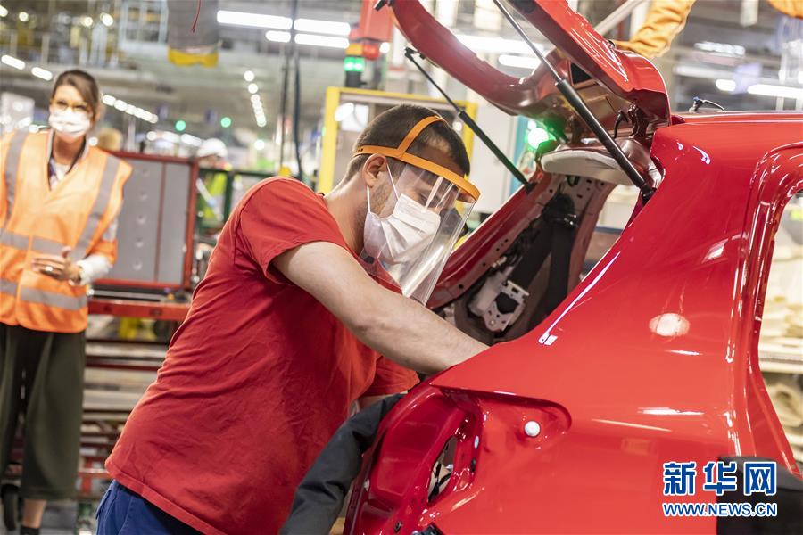 4月28日,工人在位于法国瓦朗西安纳的丰田汽车公司车间工作。 位于法国瓦朗西安纳的丰田汽车公司4月23日开始逐渐复工。工人在工作过程中需要佩戴口罩,并在车间、办公室和休息室保持社交距离,公司为工人提供自制防护面罩及消毒免洗洗手液等防护用品。 新华社发
