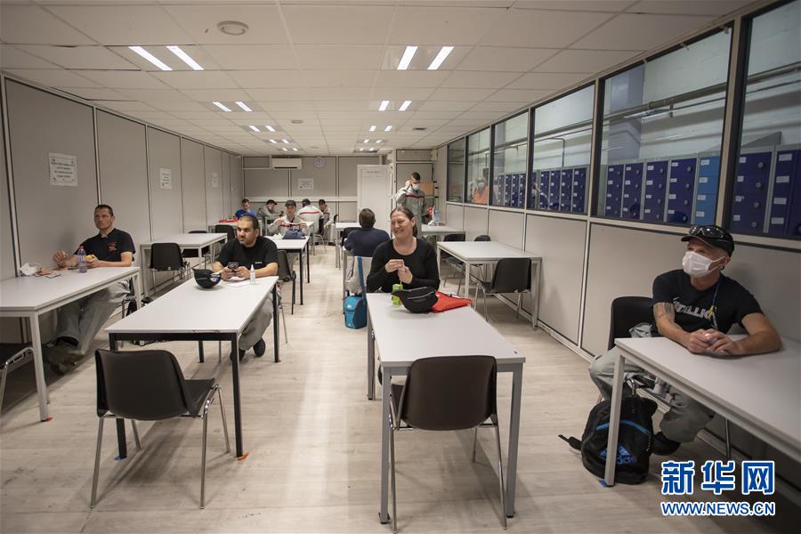 4月28日,人们在位于法国瓦朗西安纳的丰田汽车公司休息室保持社交距离。 位于法国瓦朗西安纳的丰田汽车公司4月23日开始逐渐复工。工人在工作过程中需要佩戴口罩,并在车间、办公室和休息室保持社交距离,公司为工人提供自制防护面罩及消毒免洗洗手液等防护用品。 新华社发