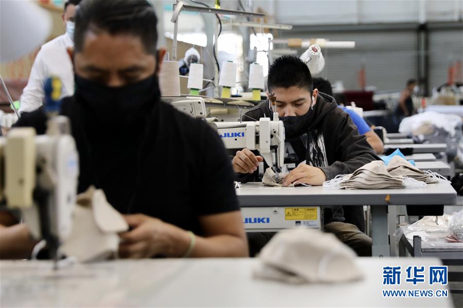 4月16日,工人在美国洛杉矶一家工厂缝制口罩。 新华社发