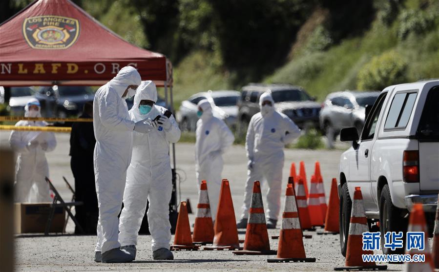 3月27日,工作人员在美国洛杉矶的新冠病毒免下车检测站工作。 新华社发