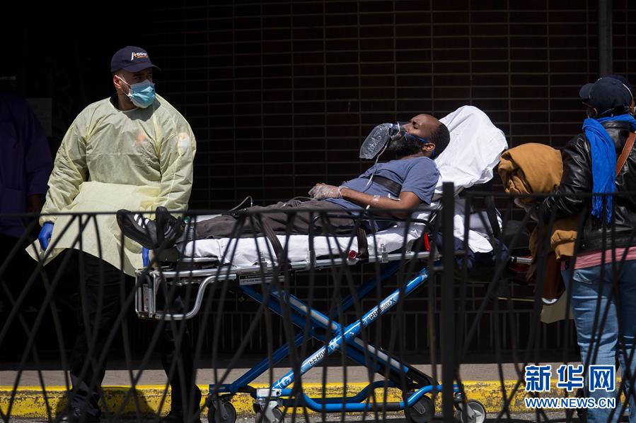 4月14日,在美国纽约,医护人员将患者送入一家医院。 新华社发(郭克摄)