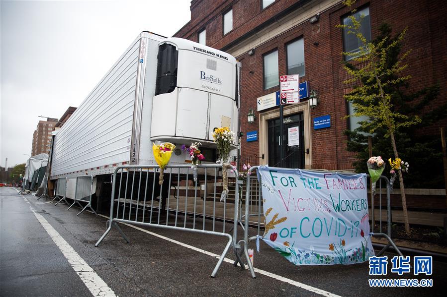 4月24日,在美国纽约布鲁克林区一家医院外,一处临时停尸间外摆放着鲜花。 新华社发(郭克摄)