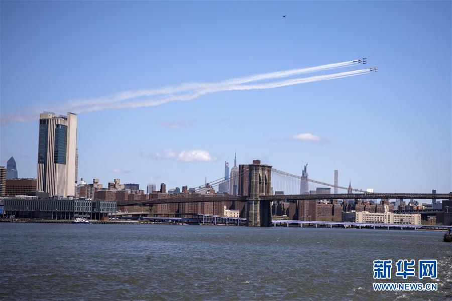 4月28日,“雷鸟”和“蓝天使”飞行表演队编队飞过美国纽约上空。当日,美国空军“雷鸟”飞行表演队和海军“蓝天使”飞行表演队编队飞过纽约、新泽西等地,向抗击疫情一线的医护人员和关键行业员工致敬。 新华社发(郭克摄)