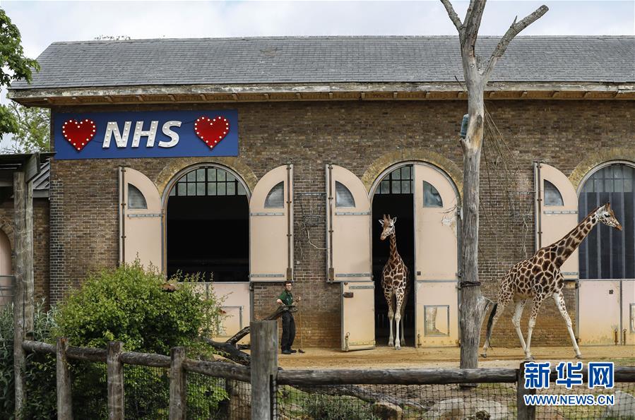 4月29日,在英国伦敦动物园,两只长颈鹿走出圈舍。感谢NHS(英国国民保健制度)医护工作者的标识挂在外墙上。 因新冠疫情,伦敦动物园已关闭数周。 新华社记者 韩岩 摄