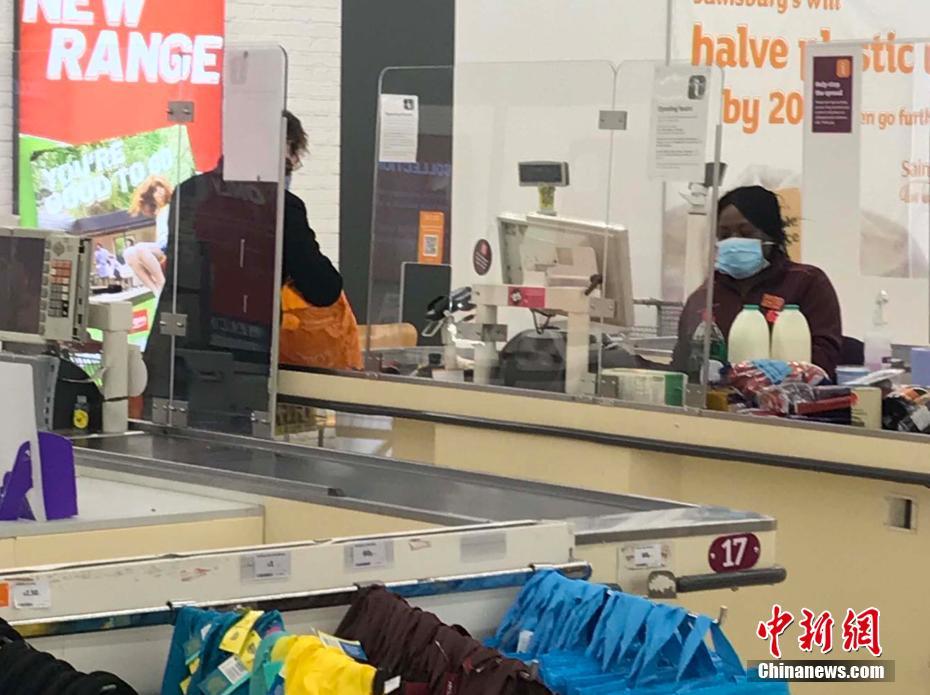 4月29日,新冠病毒死亡人数达26097人的英国,全球排名位居第五。“疫情高峰期”下,持续实行“社会疏离”措施的“禁足令”,使伦敦市民日常生活发生了根本性改变。图为伦敦一购物中心的结账柜台上,新竖立起了防疫透明隔板。中新社记者 张平 摄