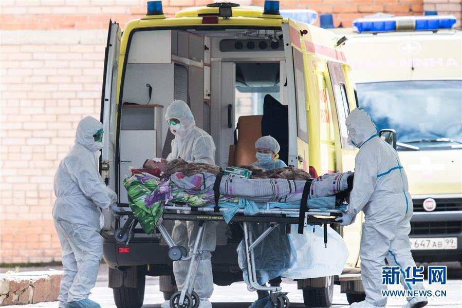4月29日,在俄罗斯莫斯科州希姆基市,医护人员转移一名患者。 据俄罗斯防疫指挥部29日的消息,过去24小时俄新增新冠确诊病例5841例,累计确诊99399例。 新华社/卫星社