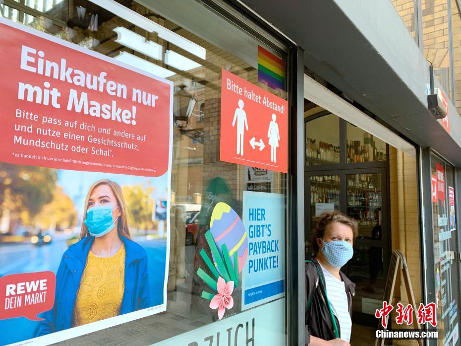4月29日,德国柏林市政府开始将该市“口罩强制令”的范围从此前仅限于公共交通工具扩大至包含超市和各类零售商店。柏林是德国16个州中最后一个实施“购物和出行均必须佩戴”的州。图为当天下午,一名戴口罩的顾客步出柏林市中心的REWE超市,超市门口张贴了醒目的“必须戴口罩购物”提示。中新社记者 彭大伟 摄