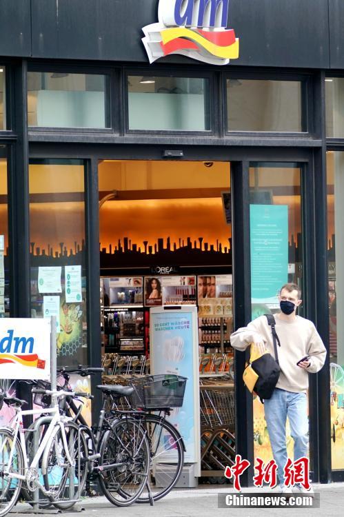 4月29日,德国柏林市政府开始将该市“口罩强制令”的范围从此前仅限于公共交通工具扩大至包含超市和各类零售商店。柏林是德国16个州中最后一个实施“购物和出行均必须佩戴”的州。图为当天下午,一位戴口罩的顾客步出柏林市中心的dm药妆连锁店。中新社记者 彭大伟 摄