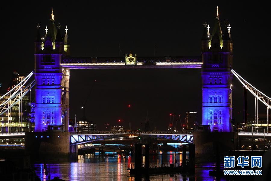 这是4月30日在英国伦敦拍摄的亮灯的伦敦塔桥。 当晚八时,伦敦的一些地标建筑点亮象征英国国民保健制度(NHS)的蓝灯,以示对抗击新冠疫情的医护人员的敬意。 新华社发(蒂姆·爱尔兰摄)