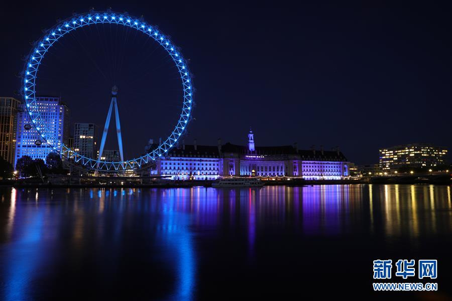 这是4月30日在英国伦敦拍摄的亮灯的“伦敦眼”。 当晚八时,伦敦的一些地标建筑点亮象征英国国民保健制度(NHS)的蓝灯,以示对抗击新冠疫情的医护人员的敬意。 新华社发(蒂姆·爱尔兰摄)
