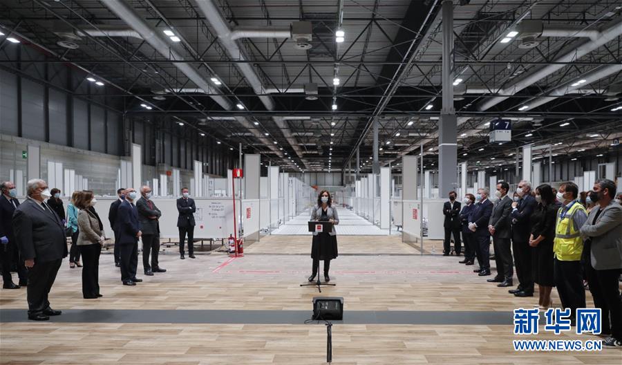5月1日,西班牙马德里自治区主席伊莎贝尔·迪亚斯·阿尤索(中)在马德里会展中心野战医院关闭仪式上致辞。 当日,由马德里会展中心改建的野战医院宣布关闭。自3月22日以来,该医院共收治约4000名新冠肺炎患者。 新华社发(马德里自治区政府供图)