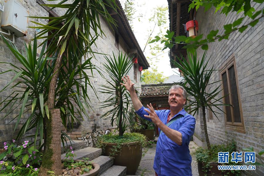 在广西阳朔县,伊恩·汉姆林顿介绍他的民宿“秘密花园”(4月30日摄)。 新华社记者 吴思思 摄