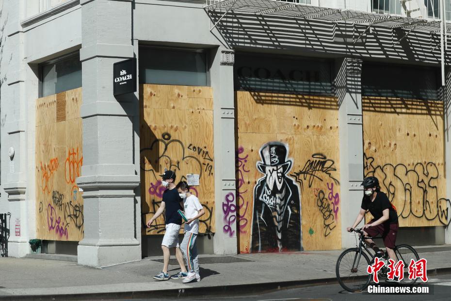 当地时间5月3日,纽约SOHO商业区许多商店仍然用木板封闭着店铺,随着纽约疫情的好转,该商区街头逐渐有稀疏的行人。中新社记者 廖攀 摄