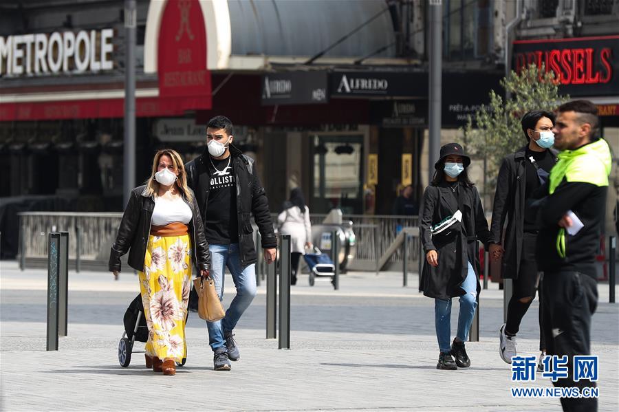 5月4日,行人佩戴口罩走在比利时布鲁塞尔街上。 新华社记者 郑焕松 摄