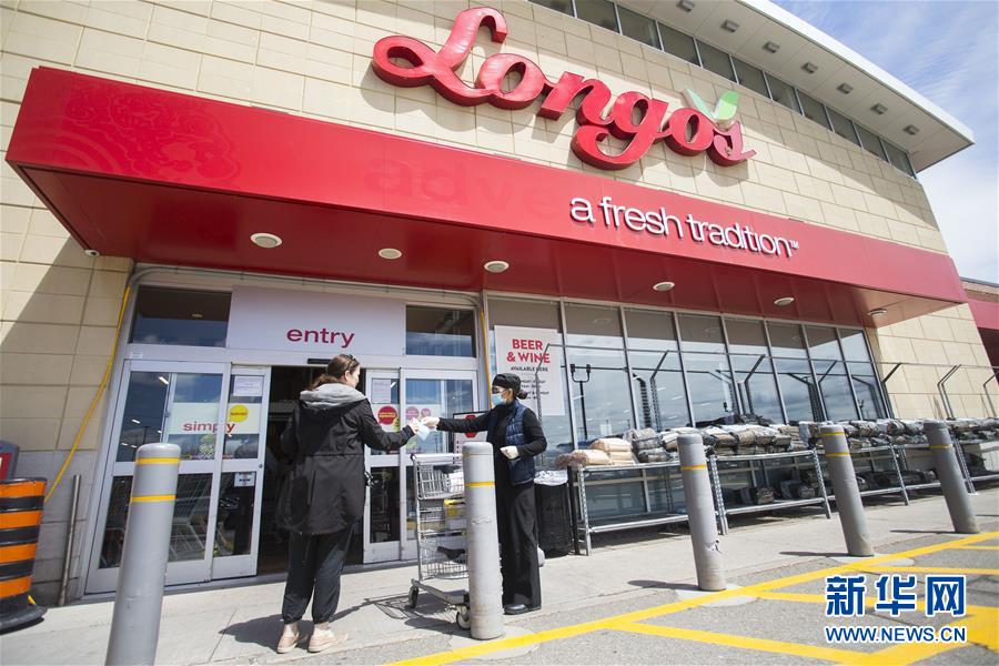5月4日,在加拿大米西索加市,工作人员在一家超市入口向顾客发口罩。 截至当日下午,加拿大累计新冠确诊病例升至60650例,累计死亡3842例。 新华社发(邹峥摄)