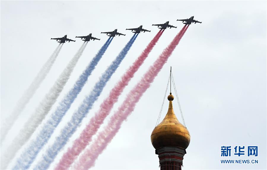 5月4日,在俄罗斯首都莫斯科,苏-25攻击机编队参加胜利日空中阅兵彩排。 俄罗斯4日在莫斯科举行胜利日空中阅兵彩排,为即将到来的胜利日空中阅兵做准备。 新华社/卫星社