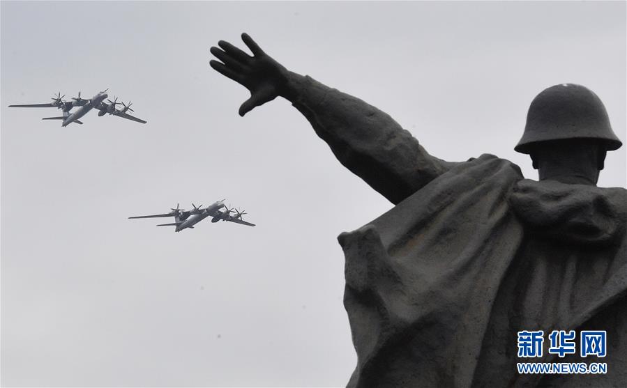 5月4日,在俄罗斯首都莫斯科,图-95MS战略轰炸机编队参加胜利日空中阅兵彩排。 俄罗斯4日在莫斯科举行胜利日空中阅兵彩排,为即将到来的胜利日空中阅兵做准备。 新华社/卫星社