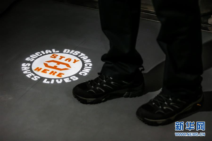 这是5月5日在菲律宾奎松城的轻轨列车里拍摄的一处保持社交距离的标识。 当日,菲律宾奎松城轻轨为“解封”后的运营做准备。奎松城当前正在执行的严格社区隔离政策将持续至5月15日,内容包括公共交通暂停运营,食品及生活必需品供应受到管制等。 新华社发(乌马利摄)