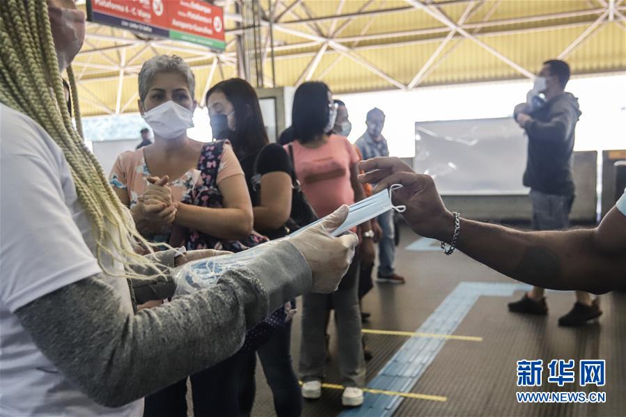 5月5日,在巴西圣保罗的一个地铁站内,工作人员给乘客分发口罩。新华社发(拉赫尔·帕特拉索摄)