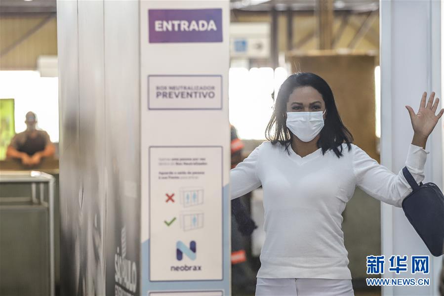 5月5日,在巴西圣保罗的一个地铁站内,一名乘客通过消毒装置。新华社发(拉赫尔·帕特拉索摄)