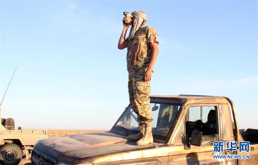5月5日,在利比亚的黎波里西南约140公里处的瓦提耶空军基地附近,利比亚民族团结政府的武装人员站在车顶。 利比亚民族团结政府的发言人5日称,利比亚民族团结政府与东部武装“国民军”在瓦提耶空军基地发生交火,造成“国民军”人员伤亡,车辆被毁。“国民军”同时表示,该组织在瓦提耶空军基地打死数十名民族团结政府的士兵。 新华社发(哈姆扎·图尔基亚摄)