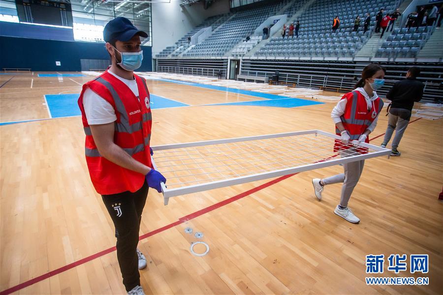 5月5日,在克罗地亚东部城市奥西耶克一家由体育馆改建的临时医院,当地红十字会工作人员运送拆解后的病床零件。新华社发(亚沃罗维奇 摄)