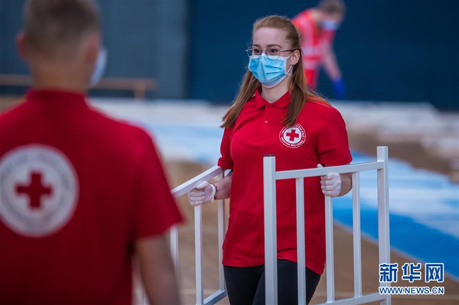 5月5日,在克罗地亚东部城市奥西耶克一家由体育馆改建的临时医院,当地红十字会工作人员运送拆解后的病床零件。新华社发(亚沃罗维奇 摄)