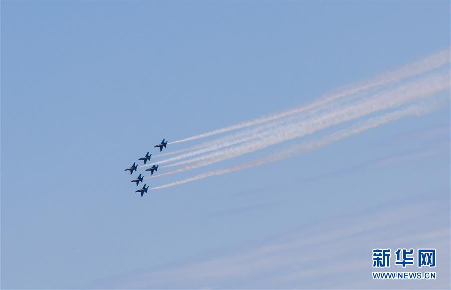 5月6日,美国海军“蓝天使”飞行表演队编队飞过得克萨斯州达拉斯和沃斯堡地区。 新华社发(田丹摄)