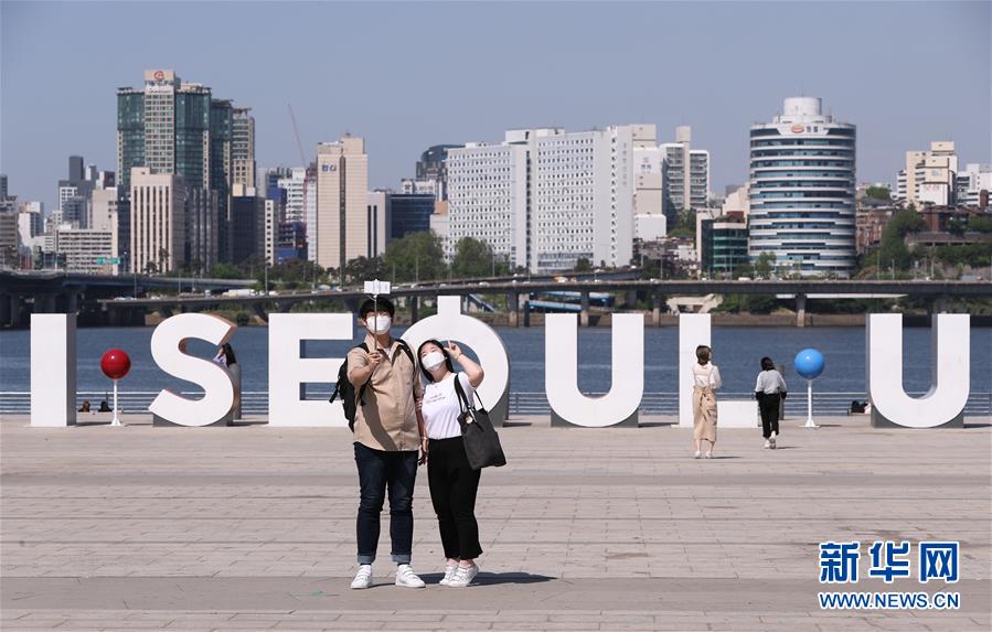 5月6日,一对男女在韩国首尔汝矣岛汉江公园自拍。 韩国鉴于国内疫情形势趋稳,从6日起进入日常生活和防疫工作并行的“生活防疫阶段”,个人基本防疫守则包括勤洗手、周期性消毒和通风换气、人与人之间保持距离、身体不适应居家观察等。 新华社记者 王婧嫱 摄
