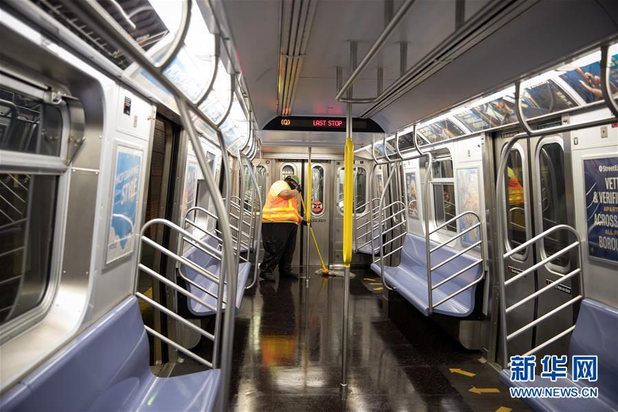 5月6日,在美国纽约,地铁工作人员对地铁车厢进行清洁。 6日起,为应对新冠疫情,原本24小时运营的纽约地铁开始在每天凌晨1点到5点暂停运营,对车辆进行全面消毒。 新华社发 (郭克摄)