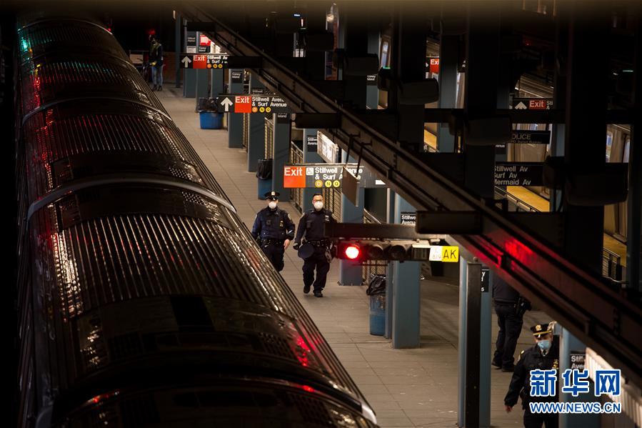 5月6日,在美国纽约,警察在凌晨停运的地铁站巡逻。 6日起,为应对新冠疫情,原本24小时运营的纽约地铁开始在每天凌晨1点到5点暂停运营,对车辆进行全面消毒。 新华社发 (郭克摄)