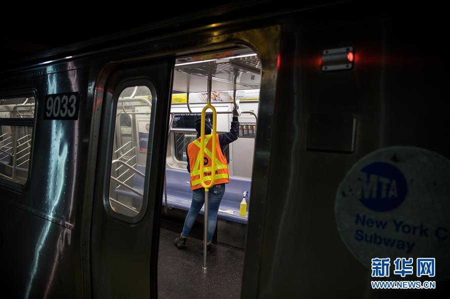 5月6日,在美国纽约,地铁工作人员对地铁车厢进行消毒。 6日起,为应对新冠疫情,原本24小时运营的纽约地铁开始在每天凌晨1点到5点暂停运营,对车辆进行全面消毒。 新华社发 (郭克摄)