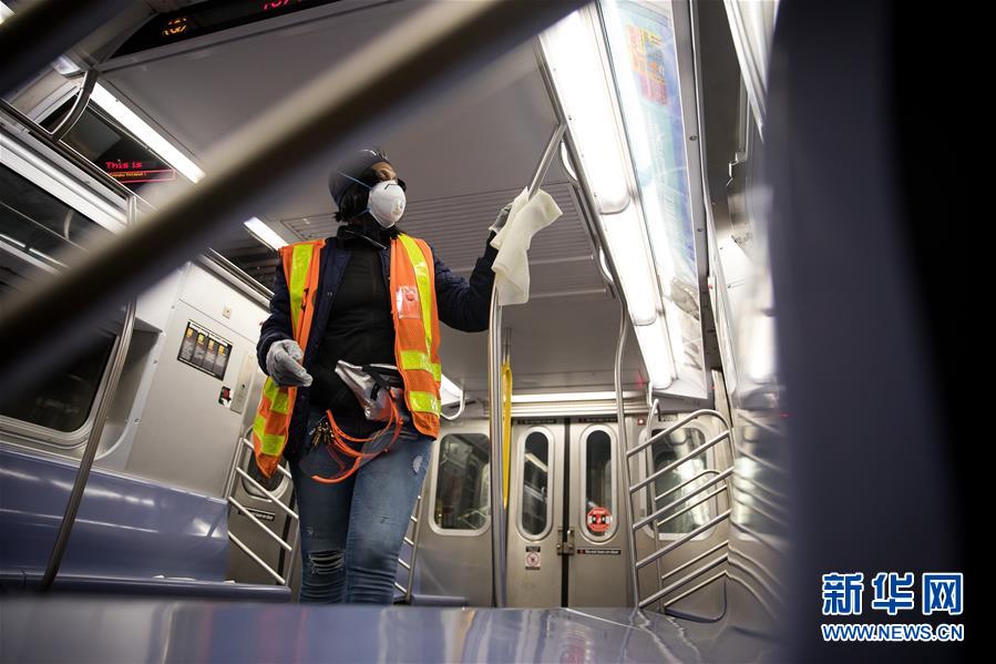5月6日,在美国纽约,地铁工作人员对地铁车厢进行消毒。 6日起,为应对新冠疫情,原本24小时运营的纽约地铁开始在每天凌晨1点到5点暂停运营,对车辆进行全面消毒。 新华社发 (郭克摄)