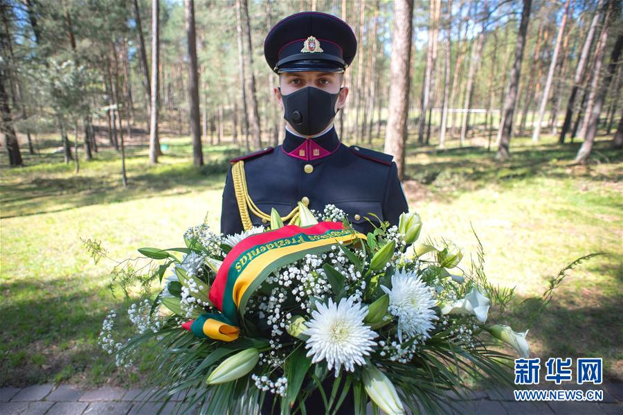 5月8日,在立陶宛维尔纽斯,士兵参加纪念活动。新华社发(阿尔弗雷达斯·普里亚迪斯摄)