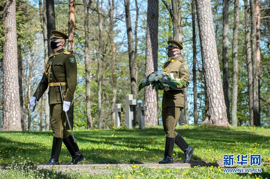 5月8日,在立陶宛维尔纽斯,士兵参加纪念活动。 新华社发(阿尔弗雷达斯·普里亚迪斯摄)