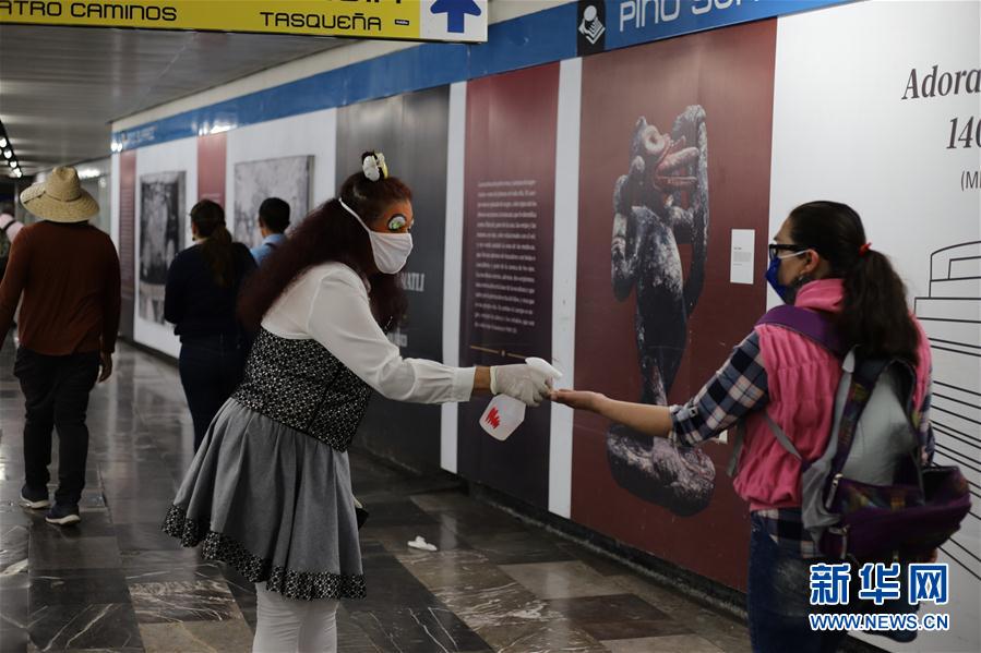 5月7日,在墨西哥首都墨西哥城的一处地铁站内,工作人员(前左)为乘客进行消毒。 墨西哥卫生部7日数据显示,该国新增确诊病例1982例,累计确诊29616例;新增死亡病例257例,累计死亡2961例。 新华社发(森尼·金特罗 摄)