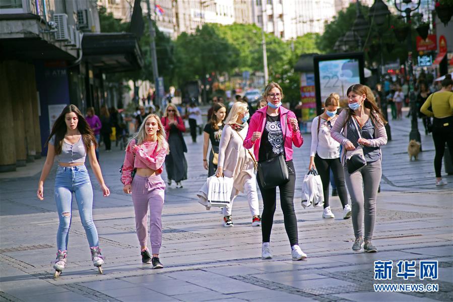 5月8日,人们走在塞尔维亚贝尔格莱德街头。 塞尔维亚6日解除国家紧急状态,并从7日起取消宵禁制度,购物中心于5月8日重新开门,幼儿园和学校定于5月11日复课。 新华社发(内马尼亚·恰布里奇摄)