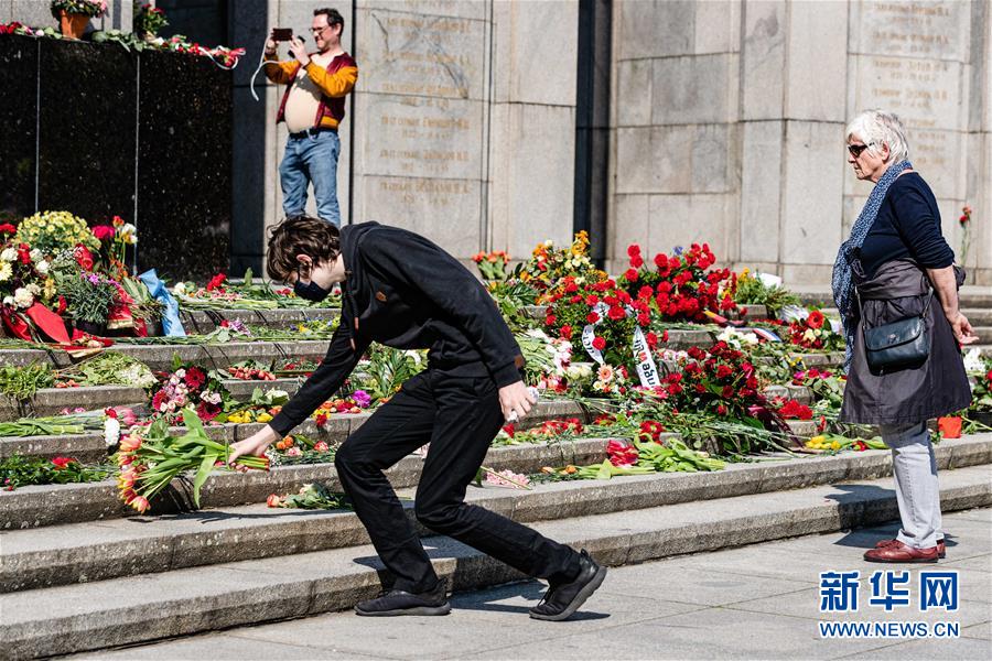 5月8日,在德国首都柏林,一名男子向蒂尔加滕苏军纪念碑献花。 当日,许多德国柏林民众自发前往相关场所纪念第二次世界大战“欧洲胜利日”75周年。 新华社发(张平摄)